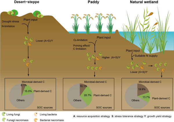 研究首次在极端干旱区明确了微生物生活史策略是调控土壤碳库稳定性的关键,指出天然湿地的保护对于维持干旱区碳汇功能至关重要,而稻田管理需注重控制盐分与氮磷平衡施肥,以促进土壤碳的持久固存。