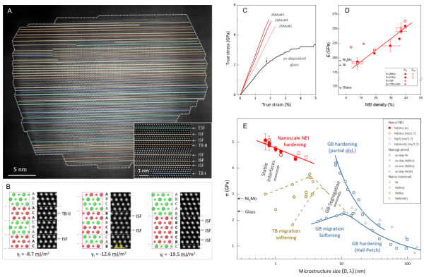通过在镍基过饱和固溶体合金中构筑极高密度稳定的“负能界面” (A、B),有效阻碍位错及界面运动,完全抑制塑性变形,显著提升杨氏模量(C、D),提升材料强度接近理论极限