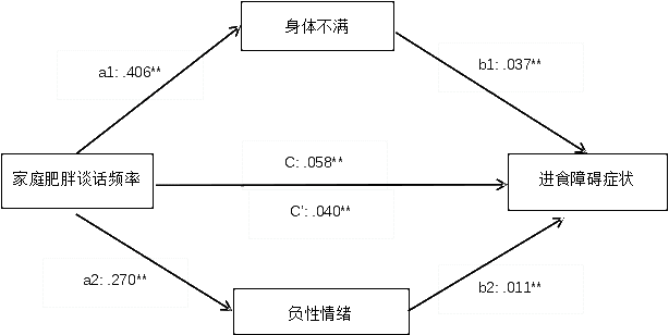 研究发现,有67.1%的家庭存在“肥胖谈话”现象,这类谈话与青少年进食障碍风险存在中高度相关(男生:r=0.56;女生:r=0.63),且与他们的身体不满意度及负性情绪呈中高度相关。同时,研究显示,家庭“肥胖谈话”直接与青少年进食障碍症状之间存在关联,还可能通过体像不满和负性情绪,间接地与进食障碍症状关联在一起。尤其在女生中,家庭“肥胖谈话”经由体像不满和进食障碍症状之间的关联更需关注。