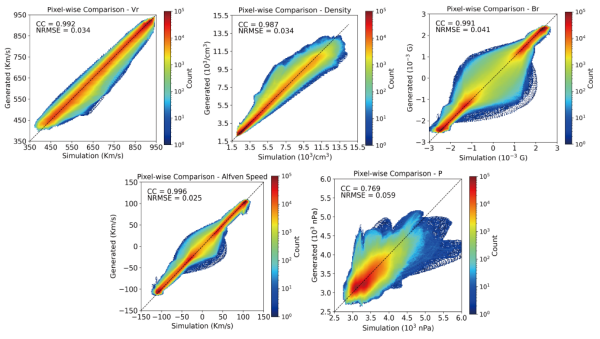 模型在测试集上取得了高精度的重建结果:径向速度、数密度和径向磁场的相关系数分别达到0.992、0.987和0.991;推导的阿尔文速度与动压的相关性分别达到0.996和0.769。模型准确再现了关键太阳风参数的空间分布,并捕捉到其随时间变化的动态演化规律。同时,在计算效率方面,单次预测在仅使用CPU时耗时约7.8秒,在GPU环境下仅需0.065秒,较传统COCONUT MHD模拟分别提升约15倍和1800倍。