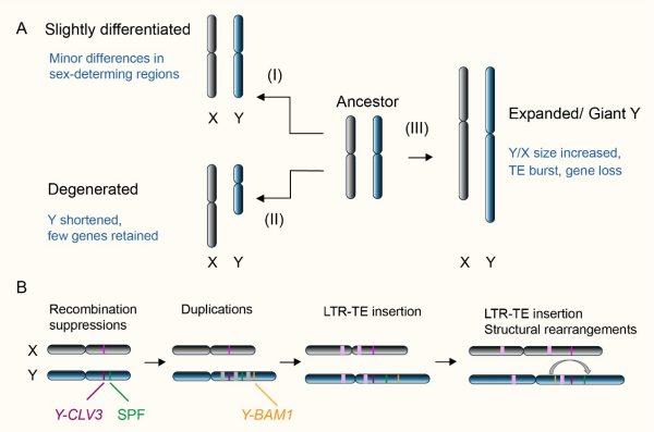 植物在同型性染色体阶段,X和Y染色体相似,大部分区域可自由重组;异型性染色体阶段,Y染色体或因长期缺乏重组而积累突变、重复序列和转座元件,发生基因丢失,最终变得巨大或退化。在石竹科蝇子草属植物中,团队研究了巨型Y染色体的起源与演化机制。